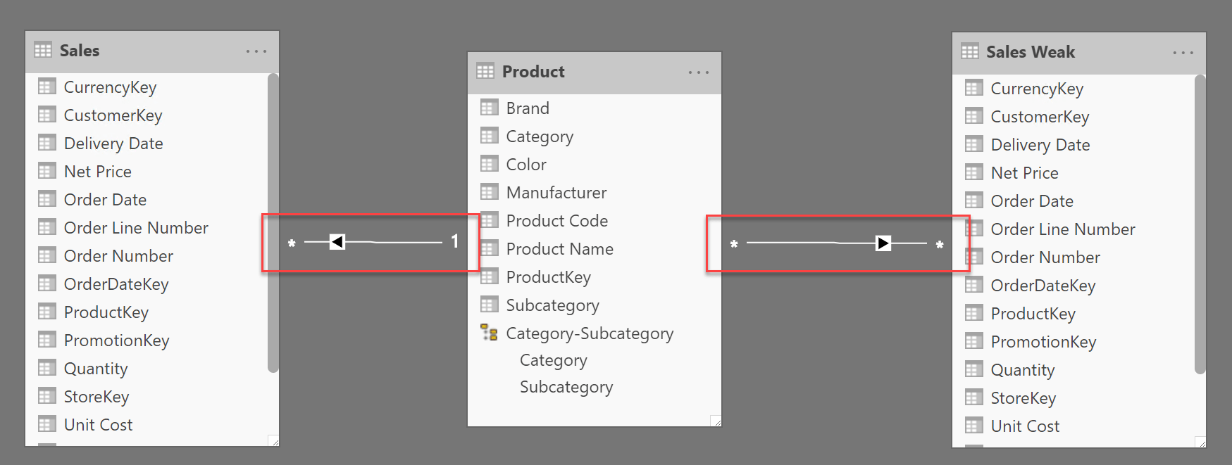 This can be the source of some surprising behavior. As an example, look at the following model: there are two identical copies of the Sales table, but the relationship between Product and Sales is strong, whereas the relationship between Product and Sales Weak is defined with a many-to-many cardinality, therefore it is a weak relationship. Beware: there is no reason to define the relationship as such: it is a regular one-to-many relationship, we just used the many-to-many cross-filter to force the relationship to be weak in the continent.
